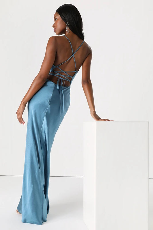 Lulus Inspire Romance Slate Blue Satin Cowl Neck Lace-Up Maxi Dress